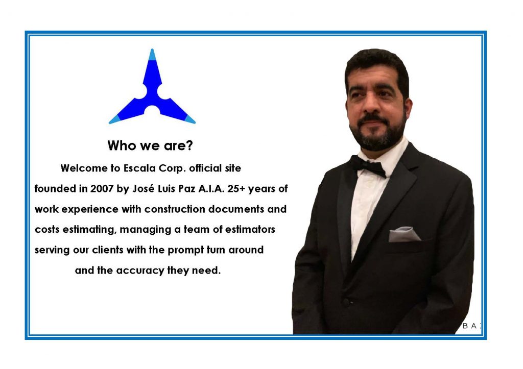 My name is José Paz, I am a Hispanic architect with base in the Chicago area. I founded the company Escala Corp. in 2007. At that time I worked for the firm Warren Johnson Architects and started operations for the request of a contractor that required support to make their estimates. That contractor was a member of the Catholic Church of Holy Spirit in Schaumburg, IL where I served as a catechist and minister of communion. What started as a ministry or social service, ended up being a professional service that began to absorb my full time, by recommending this with other contractors. It was then, in response to the ongoing service demand, that I founded together with my wife, who at that time was working as an accountant, the company Escala Corp. so that we could dedicate ourselves fully to our clients, as well as to the study and service of the Catholic Church, where I was ordained Permanent Deacon in 2013 by Cardinal Francis George.The initial contractor known as MJS Drywall and Taping is still our client today, as are most of the recommended contractors, since we deliver the estimates on time and have developed a system that has made us very successful in our calculations and criteria, and with this we support contractors who have been in business for years, even in difficult times, and this is one of our greatest prides. Our estimation service has been extended in a range that includes carpentry, concrete, partition and finishes. We are focused on analyzing in a professional manner the construction costs of each new project that is entrusted to us to empower our clients with prices that allow them to negotiate and obtain new contracts, by placing them in a competitive position that is beneficial and attractive for them as well as for your customers.